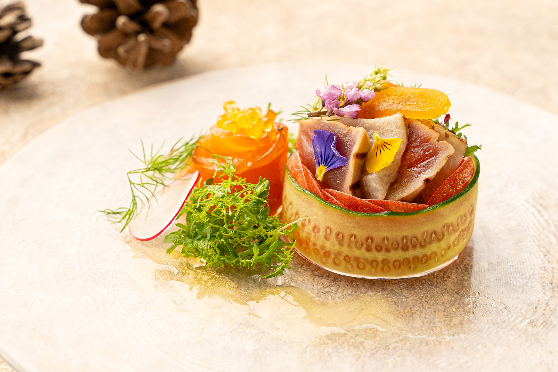 This special course celebrates the essence of Nagasaki through a fusion of cultures, incorporating the finest summer seafood and seasonal vegetables from Nagasaki, infused with Wa-Ka-Ran mix culture influences.